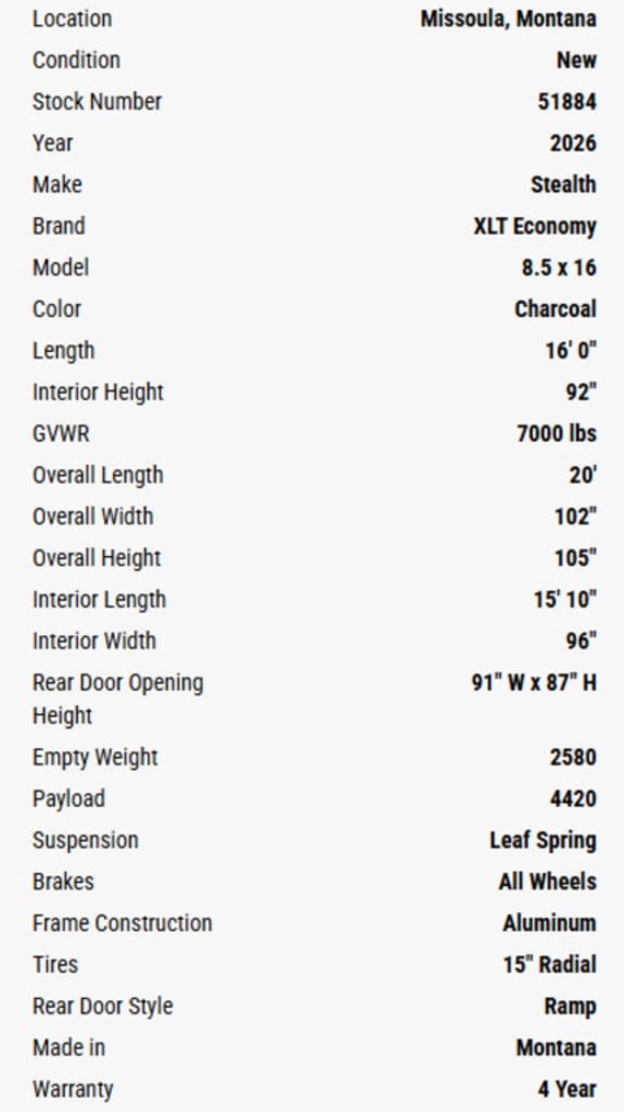 As the region’s longest-running and largest aluminum trailer outlet, Western States Trailer Missoula is proud to introduce the Montana-made XLT Pro by Stealth—our most budget-conscious aluminum trailer yet. Built on Stealth’s proven platform, the new XLT Pro model delivers essential features at a more affordable price point. Standard equipment includes a reduced box height, compact V-nose design, slimline lighting, and black mod wheels—practical upgrades that offer real value.