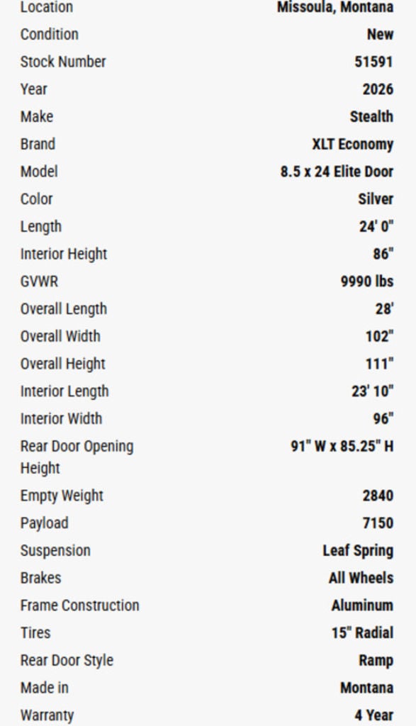 As the region’s longest-running and largest aluminum trailer outlet, Western States Trailer Missoula is proud to introduce the Montana-made XLT Pro by Stealth—our most budget-conscious aluminum trailer yet. Built on Stealth’s proven platform, the new XLT Pro model delivers essential features at a more affordable price point. Standard equipment includes a reduced box height, compact V-nose design, slimline lighting, and black mod wheels—practical upgrades that offer real value.